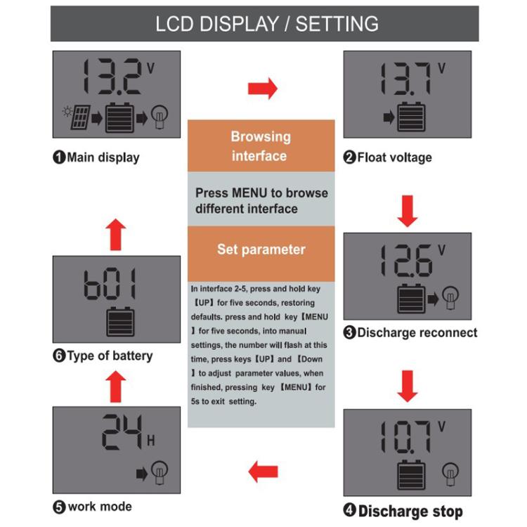 1. The controller defaults to 12V/24V auto-adaptation, when installing for the first time, please make sure to connect the battery first and ensure that the battery has enough voltage so that the controller can recognize it as the correct battery type