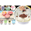 4. The set includes accessories: non-slip turntable x1, small decorating nozzle x8, 6-inch stainless steel straight spatula with wooden handle x1, 6-inch plastic stainless steel curved spatula x1, umbrella brush x1, small transparent converter x1, white Smoother x1, Cake Layerer x1, White Scraper x3, Beige Decorating Scissors x1, Small Decorating Nails x2, Decorating Pen Cap x2, Red Silicone Decorating Pen x1, 12-inch 2-30TPU Decorating Bag x1 , Disposable piping bag x100, cake cup x40 (random color)