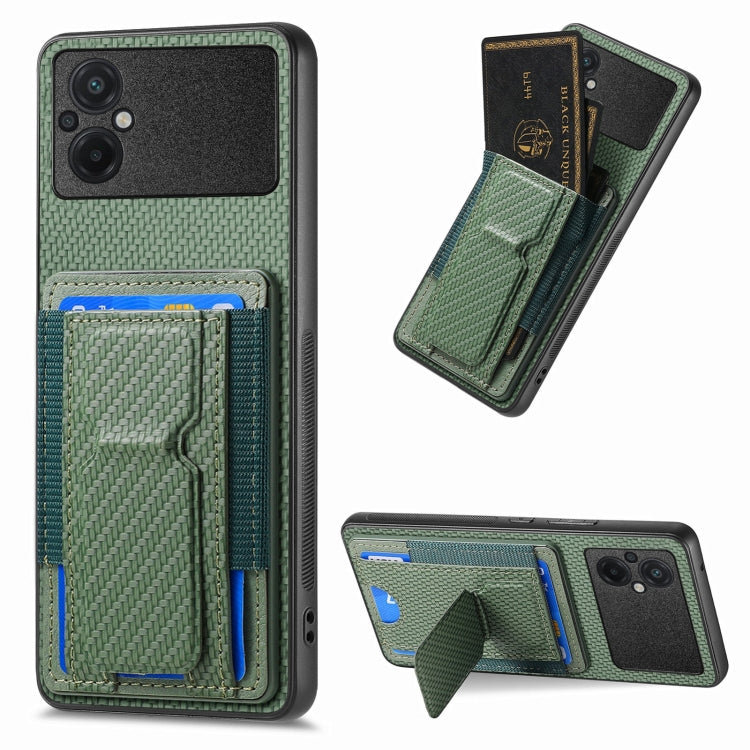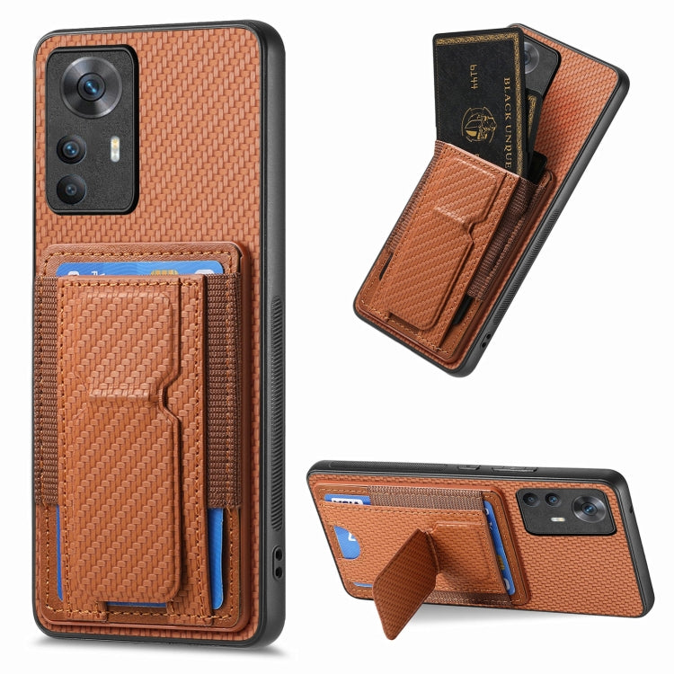Carbon Fiber Fold Stand Elastic Card Bag Phone Case, For Xiaomi 12T, For Xiaomi Poco M5 4G, For Xiaomi Poco M5s 4G, For Xiaomi Redmi K50 Ultra