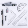 3. The set contains: compass x1, 0.7 mechanical pencil x1, protractor x1, eraser x1, 45 degree triangle x1, 60 degree triangle x1, 15 cm ruler x1, semicircle ruler x1 , 0.7 pencil lead (10 pieces) x1 box