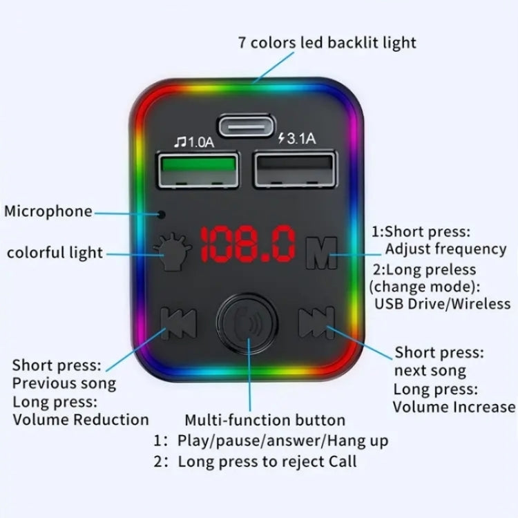 1.Colorful Breathing Atmosphere Light: 7 LED Backlight & Deep BASS Music, add more excitement impact, and fun to your driving experience