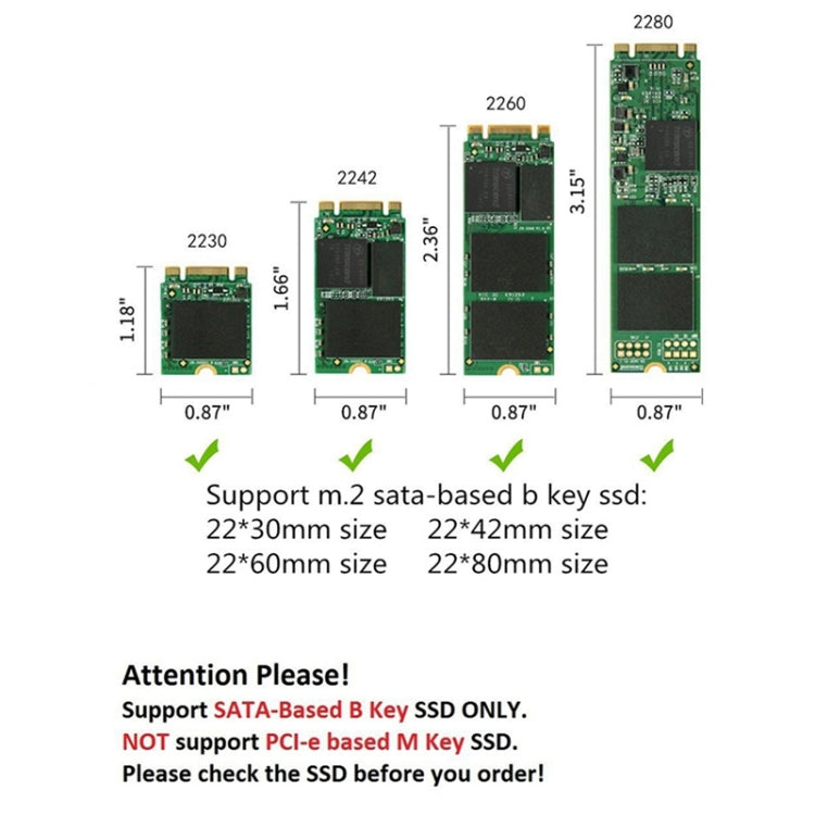 4. Support 22x30mm, 22x42mm, 22x60mm, 22x80mm NGFF (also known as m.2) solid state drive (this product does not contain hard disk).
