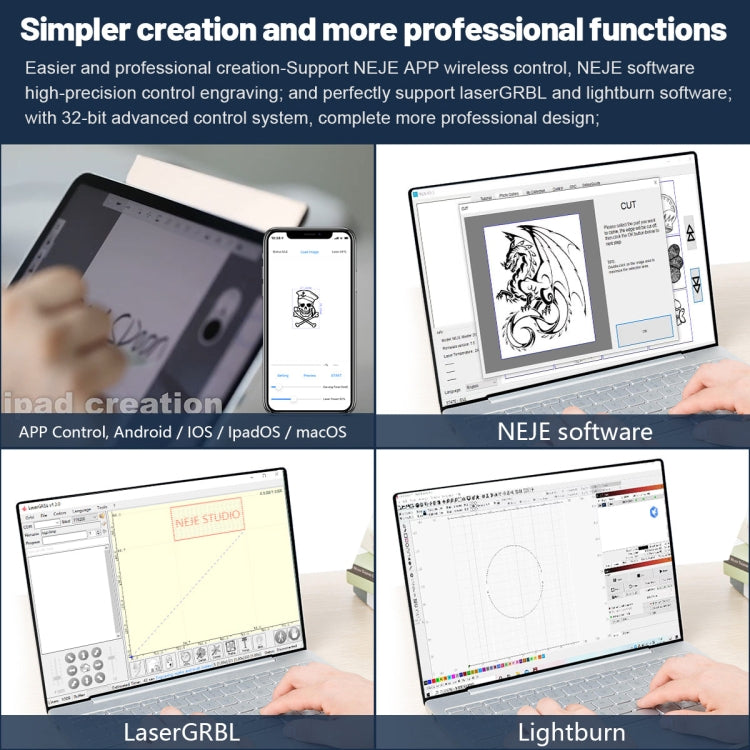 12. New 32-bit 200MHz processor+BLE+MEMS mobile control system, support NEJE Win software, NEJE Android APP, LseerGRBL, Lightburn. Support NEJE OTA software and firmware upgrades, providing users with more surprises and value.