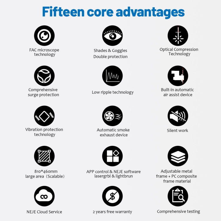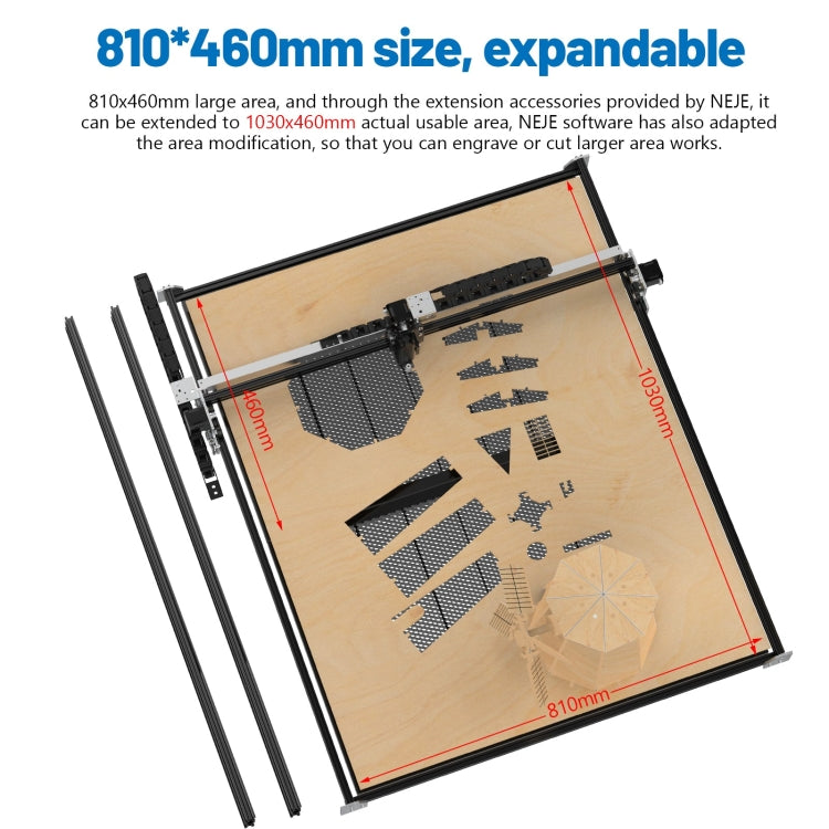 1. The standard area is 810*460, and the extended Y-axis track kit provided by NEJE can be extended to a larger area to meet the needs of large-area engraving and cutting.