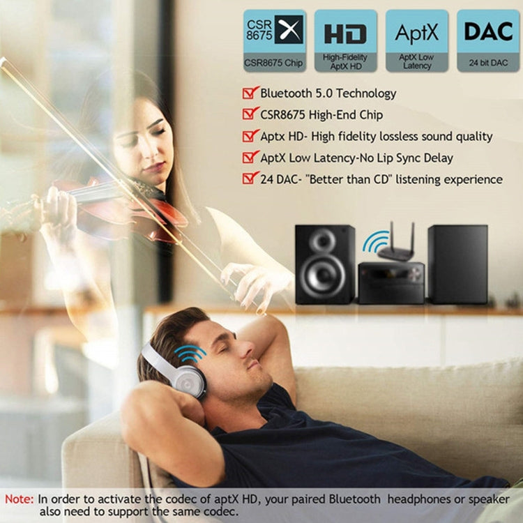 8. Support dual stream (TX mode supports one transmitter to connect two Bluetooth speakers or headphones at the same time to use one CODEC)
