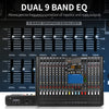 2. Mono/Stereo Channel Equalizer: Each channel has 4-band EQ design (High, Mid-High, Mid-Low, Low), high-resolution stereo level, with 12 LED lights. Built-in dual 9-segment balanced overall volume adjustment, you can adjust the volume more delicately, which is very suitable for professional singers who have high requirements for sound.